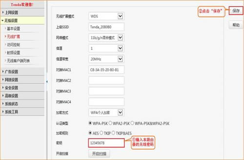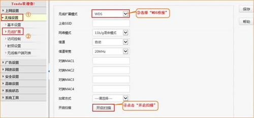 1、点击【无线设置】→【无线扩展】;在“无线扩展模式”选择“WDS”后,点击“开启扫描”;