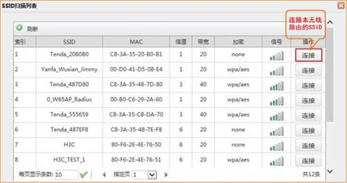 2、在弹出的对话框找到本无线路由器的ssid(无线信号名称),然后点击“连接”;