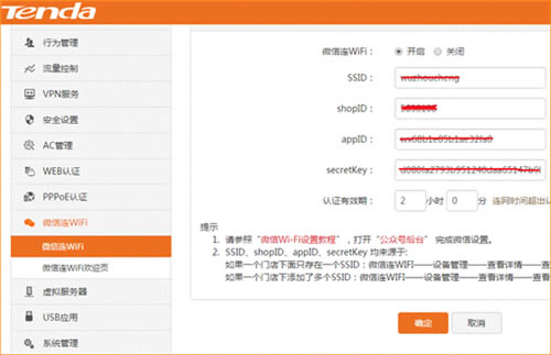 ③开启“微信连WIFI功能”,并把相应的信息填上去,并设置“认证有效时间”。