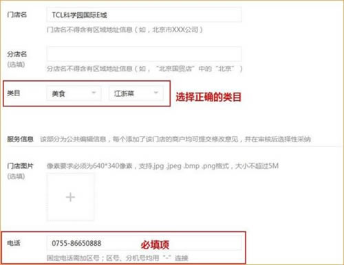 B.选择正确的“类目”,并填入正确的门店“电话”