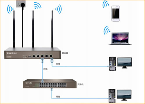 从外网接一条网线进来到路由器WAN口上,再从路由器上面LAN口分出一条网线到电脑上,设置完后进入设置界面“www.tendawifi.com”