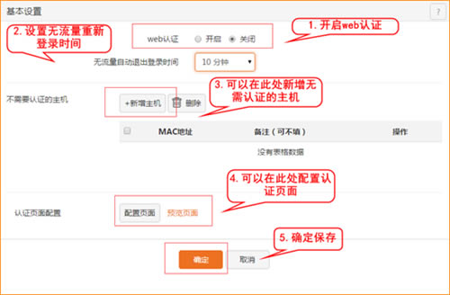 认证基础设置,首先“开启web认证”,然后“设置无流量重新登录的时间”和“认证页面的配置”,可以通过“新增主机”来设置免认证的主机,设置完成后点击“确定”保存。