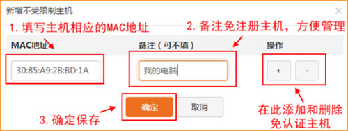 2.新增不受限制主机设置,填写主机的“MAC地址”,修改“备注”点击“添加”并“确定”