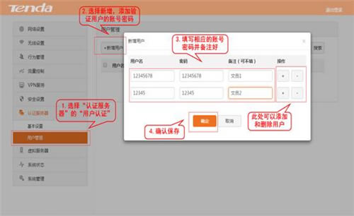 认证的账号密码在“认证服务器”-“用户管理”-“添加用户”,设置好无线用户明后确定保存。