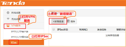 打开“VPN服务”,点击IPSec并点击“新增隧道”选项。
