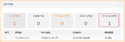 进路由器的管理页面。点击『系统状态』→『用户列表』,进入页面。当“IPSEC 安全联盟”显示连接数量时,设置成功。