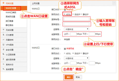 ①如果您是拨号上网用户,联网方式选择“ADSL”,然后输入运营商给您的宽带账号与密码,选择您使用的运营商,在“线路带宽”处填写运营商提供的上行与下行带宽。继续输入您申请的带宽后点击“确定”即可联网;
