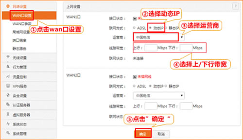 ②如果你是动态IP上网的用户,联网方式选择“动态IP”,选择您使用的运营商,在“线路带宽”处填写运营商提供的上行与下行带宽,然后输入申请的带宽后点击“确定”即可联网;