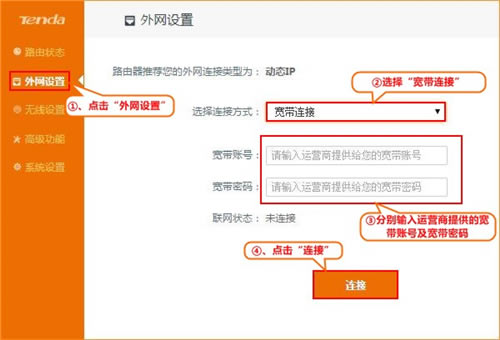 2、点击“外网设置”,选择连接方式为“宽带连接”,输入运营商提供的宽带账号及宽带密码,点击“连接”,如下图: