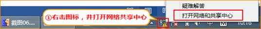 右击电脑桌面右下角的网络图标,选择“打开网络共享中心”