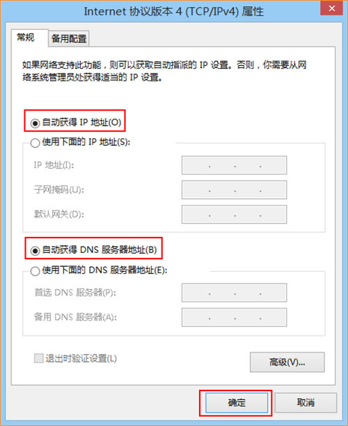 4.选择“自动获得IP地址”“自动获得DNS服务器地址”,确定即可: