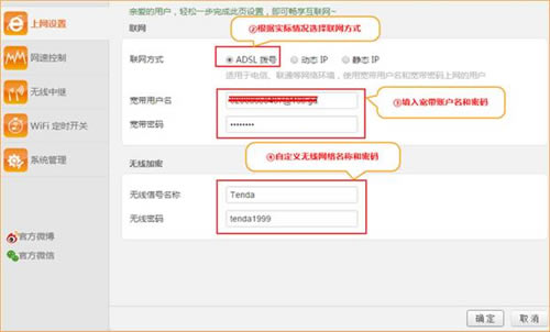 2.在上网设置中选择“ADSL拨号” ,输入宽带帐号和密码,“确定”即可,参考如下设置步骤