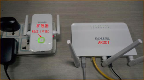 将扩展器插在距离路由器(AR301)附近不超过1米的插座上,刚插上时,RE灯是不亮的。