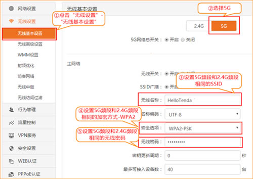 ② 保持5G信号SSID、加密方式、密码与2.4G频段一致