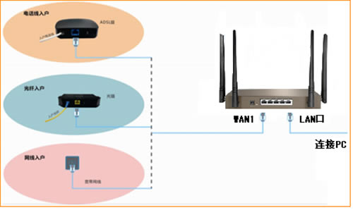 从外网接一条网线进来到路由器WAN口上,再从路由器上面LAN口分出一条网线连接到电脑上,如下图所示: