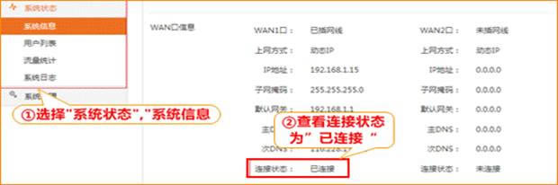2.或者点击左边菜单“系统状态”,查看“系统信息”,如图,“连接状态”显示为“已连接”表示设置成功,则可正常上网。