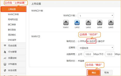 ②如果你是动态IP上网的用户,联网方式选择“动态IP”,选择您使用的运营商,在“线路带宽”处填写运营商提供的上行与下行带宽,然后输入申请的带宽后点击“确定”即可联网;