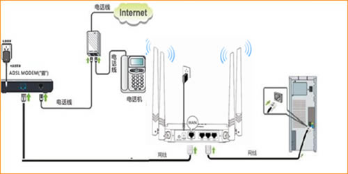1、直接将入户的网线(没有猫的用户)或者猫出来的网线(有猫的用户 )接在路由器的WAN口,再找一根短网线,一头接电脑,一头接路由器LAN1/LAN2/LAN3任意接口,接线方式如下图: