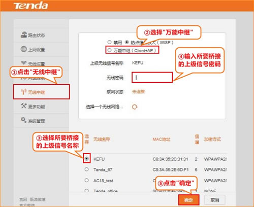 或选择“万能中继”模式,设置后本机无线信号名称为上级信号名称。