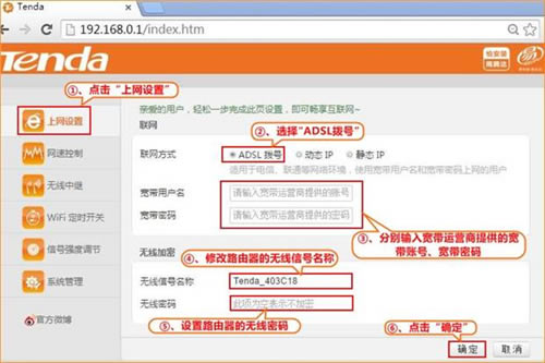 4、点击“上网设置”,选择联网方式为“ADSL拨号”,输入运营商提供的宽带账号及宽带密码,点击“确定”,如下图: