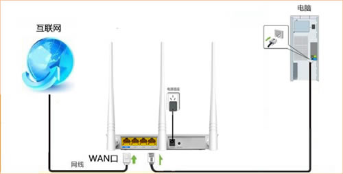 1、直接将入户的网线(没有猫的用户)或者猫出来的网线(有猫的用户 )接在路由器的WAN口,再找一根短网线,一头接电脑,一头接路由器LAN1/LAN2/LAN3任意接口,接线方式如下图: