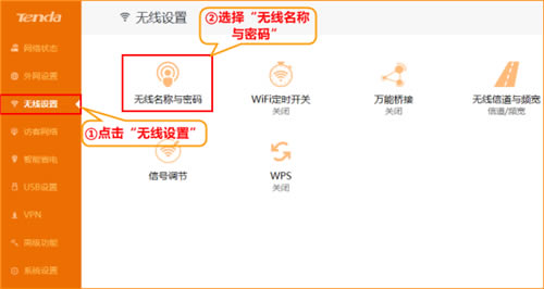 2、点击“无线设置”,选择“无线名称与密码”: