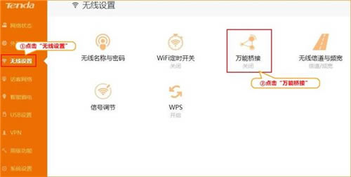 7、进入路由器的设置界面后,点击“无线设置”,选择“万能桥接”如下图: