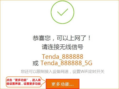 6、“设置完成,路由器正在联网中,请稍候…”,等待大约10秒钟后,在跳转界面点击“更多功能”,参考如下步骤: