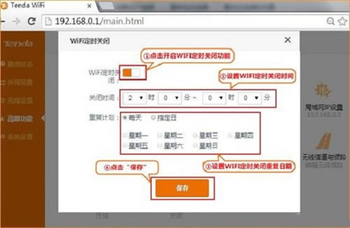 3、“WiFi定时关闭”后选择开启——>用户根据自己的实际情况,设置需要WiFi需要关闭的时间范围、日期——>然后点击“保存”。