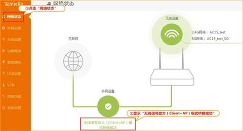 9、检查设置是否成功:等待路由器重启完成以后,重新登录腾达AC15路由器的设置界面,点击“网路状态”——>查看“外网设置”,如果显示“无线信号放大(Client+AP)模式桥接成功”,如下图所示,说明腾达AC15路由器已经可以正常上网了。