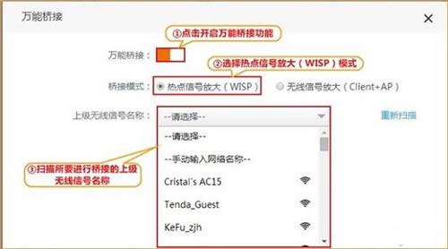 7、开启“万能桥接”,桥接模式选择“热点信号放大(WISP)”,在设备自动扫描到的无线信号中选择所需中继的上级无线信号名称,并输入密码,点击“保存”参考如下设置步骤