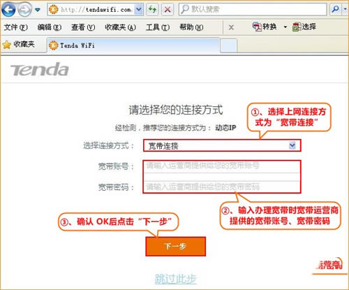 在开通宽带的时候,运营商会提供一个宽带账号、宽带密码给用户;且在未使用路由器的时候,电脑上需要使用“宽带连接”程序,填写宽带账号、密码进行拨号,拨号成功后,电脑就能上网。如果你的宽带情况与上面介绍的一致,则这里的“连接方式”就应该选择:宽带连接——>然后填写宽带运营商提供的“宽带账号”、“宽带密码”——>点击“下一步”。