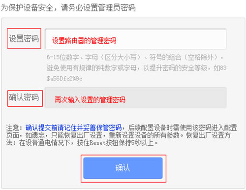 在 设置密码 框中设置管理员密码,并在 确认密码 中再次输入,点击 确认。