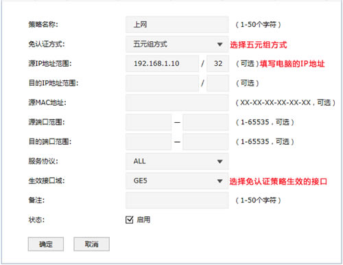 以上设置可以实现通过路由器5号口(或者5号口连接的交换机)接入的IP地址为192.168.1.10的电脑,不需要认证就可以上网。