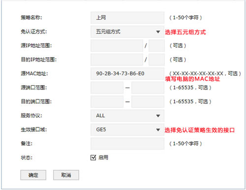 以上设置可以实现通过路由器5号口(或者5号口连接的交换机)接入的MAC地址为90-2B-34-73-B6-E0的电脑,不需要认证就可以上网。
