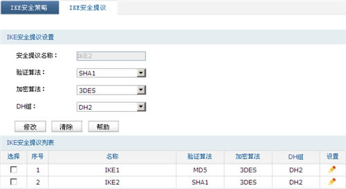 设置两条IKE安全提议,分别是MD5-3DES-DH2和SHA1-3DES-DH2。