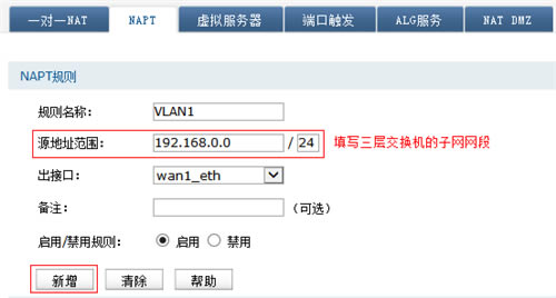 登录路由器的管理界面,点击 转发规则 >> NAT设置 >> NAPT,自定义规则名称,源地址范围填写三层交换机的子网网段。添加192.168.0.0/24网段的规则,如下图所示: