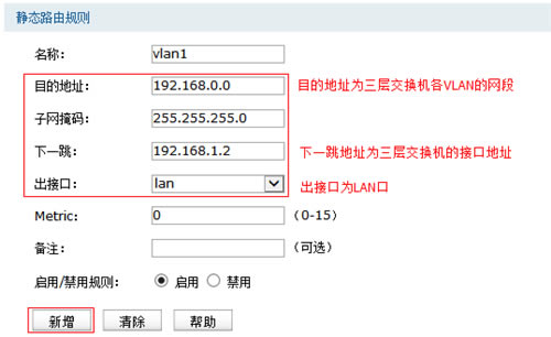 自定义规则名称,目的地址填写三层交换机各VLAN的网段地址,下一跳地址填写三层交换机连接路由器的接口地址,出接口选择LAN口,如下图所示: