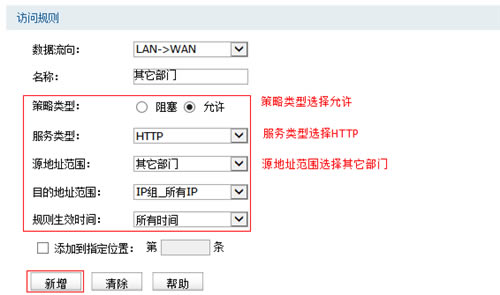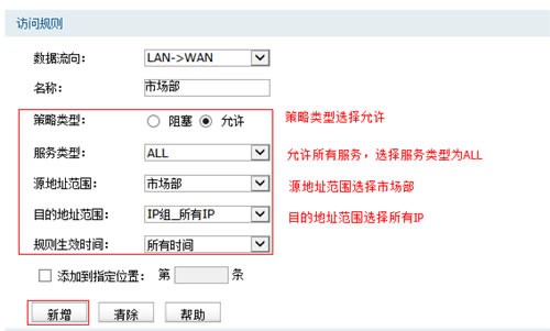 登录路由器的管理界面,点击 安全管理 >> 访问策略,添加策略规则:允许市场部访问所有网络应用,如下图所示: