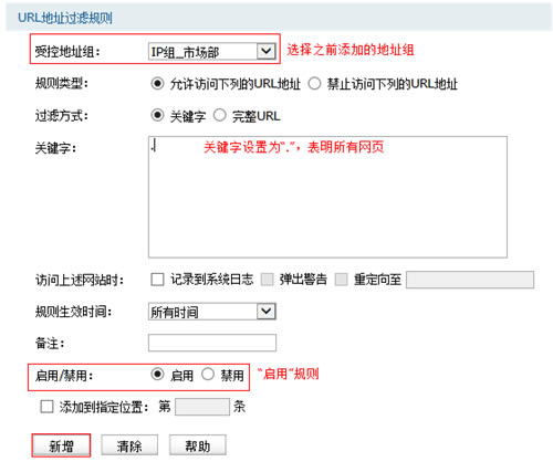 在URL地过滤规则中,受控地址组选择 市场部,规则类型选择 允许访问下列的URL地址,关键字设置为“.”,启用 规则,点击 新增。详细设置见下图: