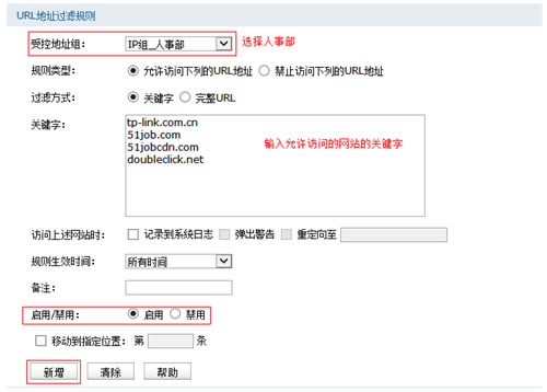 受控地址组选择 人事部,规则类型选择 允许访问下列的URL地址,关键字的位置输入允许访问的网页的关键字。如下图所示: