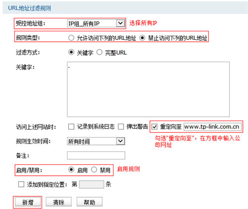 由于URL过滤规则默认是允许访问所有网页,还需要再添加阻塞所有网页的规则才可以实现需求,按需求添加规则。规则类型选择 禁止访问下列的URL地址,关键字填写“.”,重定向一栏填写公司官网域名,如下图: