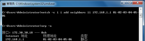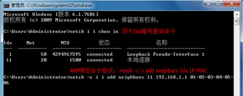 2、查询到网卡idx编号后,再使用命令 netsh –c i i add neighbors idx ip mac进行ARP绑定,如下: