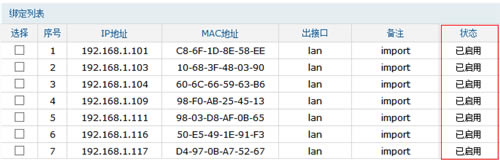 注意:如果勾选 仅允许IP MAC绑定的数据包通过路由器,则不在绑定列表或与绑定列表冲突的电脑不能上网及管理路由器。
