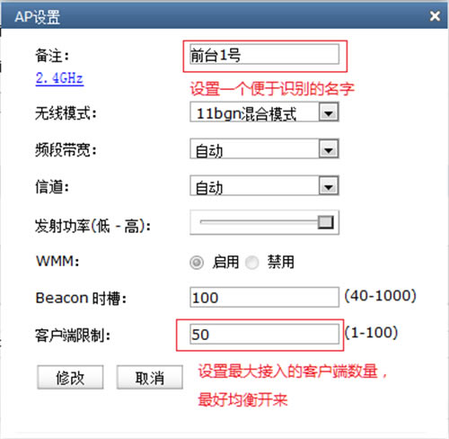 点击对应AP的修改按键,修改对应设置,如下:
