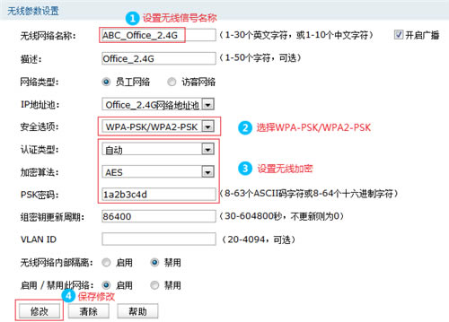 进入 无线管理 >> 2.4G无线基本设置,在无线网络列表中修改默认条目,如下: