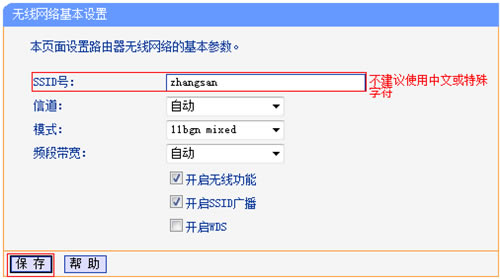 登录路由器管理界面,进入无线设置>>基本设置,在SSID中设置无线名称,点击 保存。