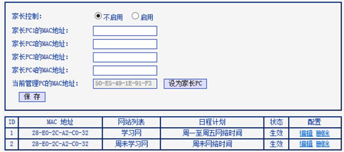 选择 启用 家长控制,如果当前管理电脑为家长的电脑,点击 设为家长PC,如果不是,请手动填写家长电脑的MAC地址,点击 保存。