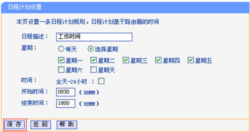 登录路由器管理界面,点击 上网控制 >> 日程计划 >> 增加单个条目,添加 工作时间,如下图所示: