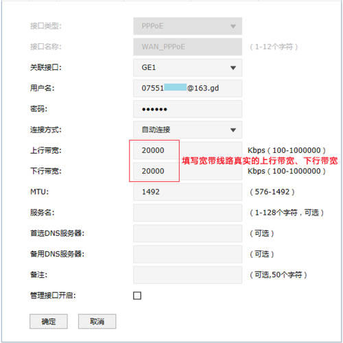 在路由器界面,点击“基本设置>接口设置”,物理接口选择为连接宽带的接口(本文以GE1为例),并点击联网条目的“编辑”(本文以PPPoE为例),填写宽带线路真实的上行带宽、下行带宽,并点击“确定”。